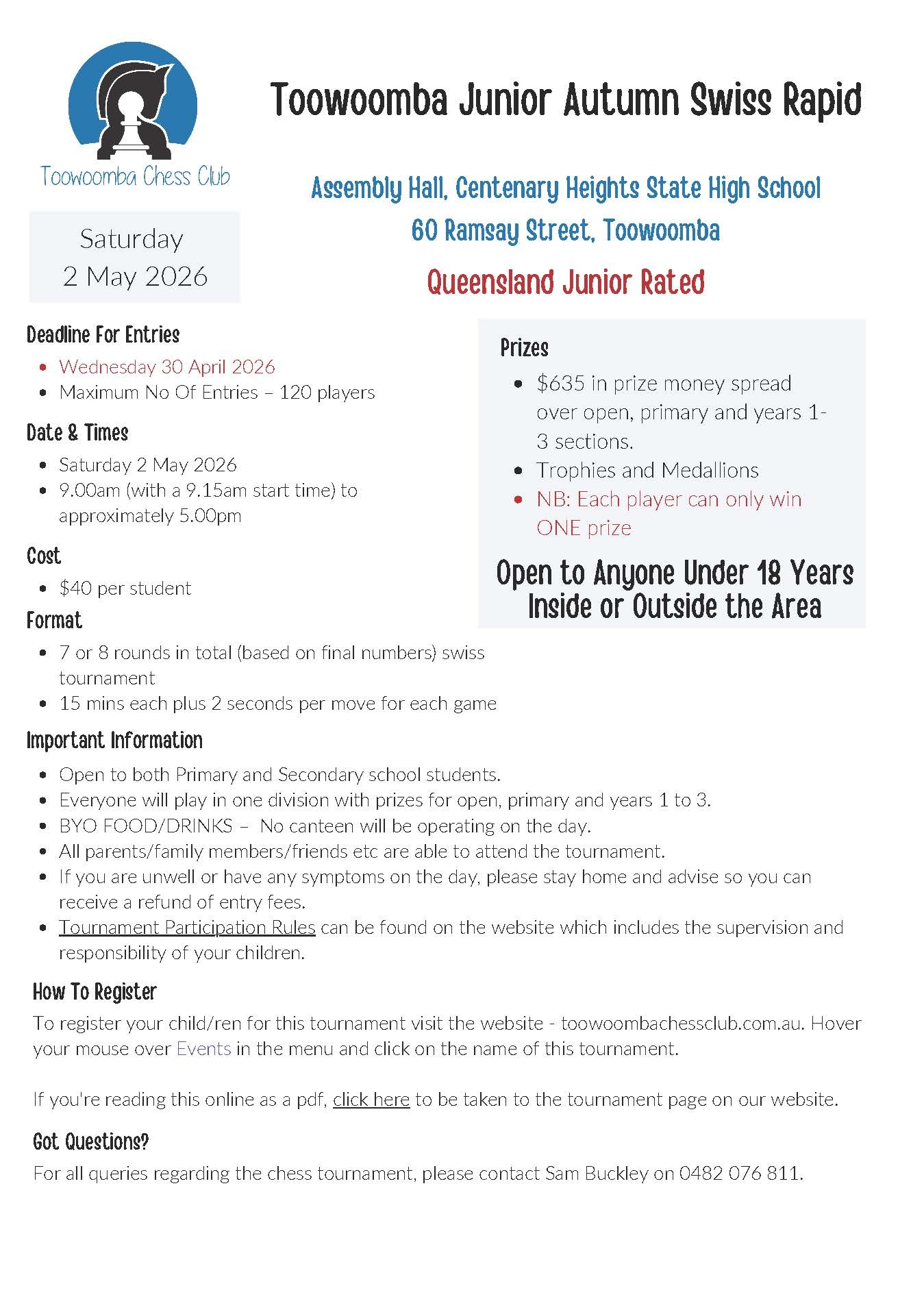 2026 Toowoomba Junior Autumn Swiss Rapid Chess Tournament